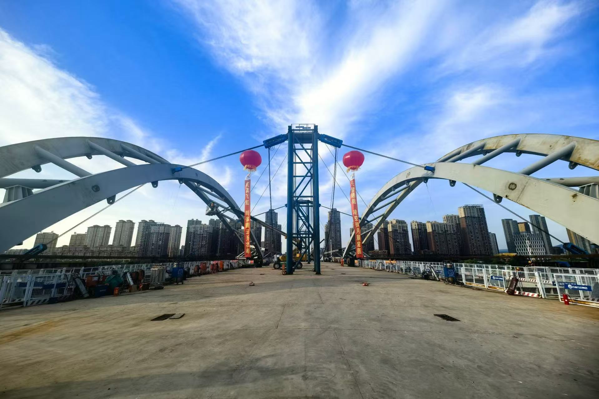红旗大桥主桥采用中承式蝶形吊杆钢箱拱结构,单跨径达100米,总重逾1315吨。此次蝶形吊杆拱肋侧向转体施工采用“水平滑移+侧向转体”技术,在主桥上完成65度旋转,此工艺在国内同类桥梁施工转体领域中尚属首例,为行业技术发展树立了新的标杆。