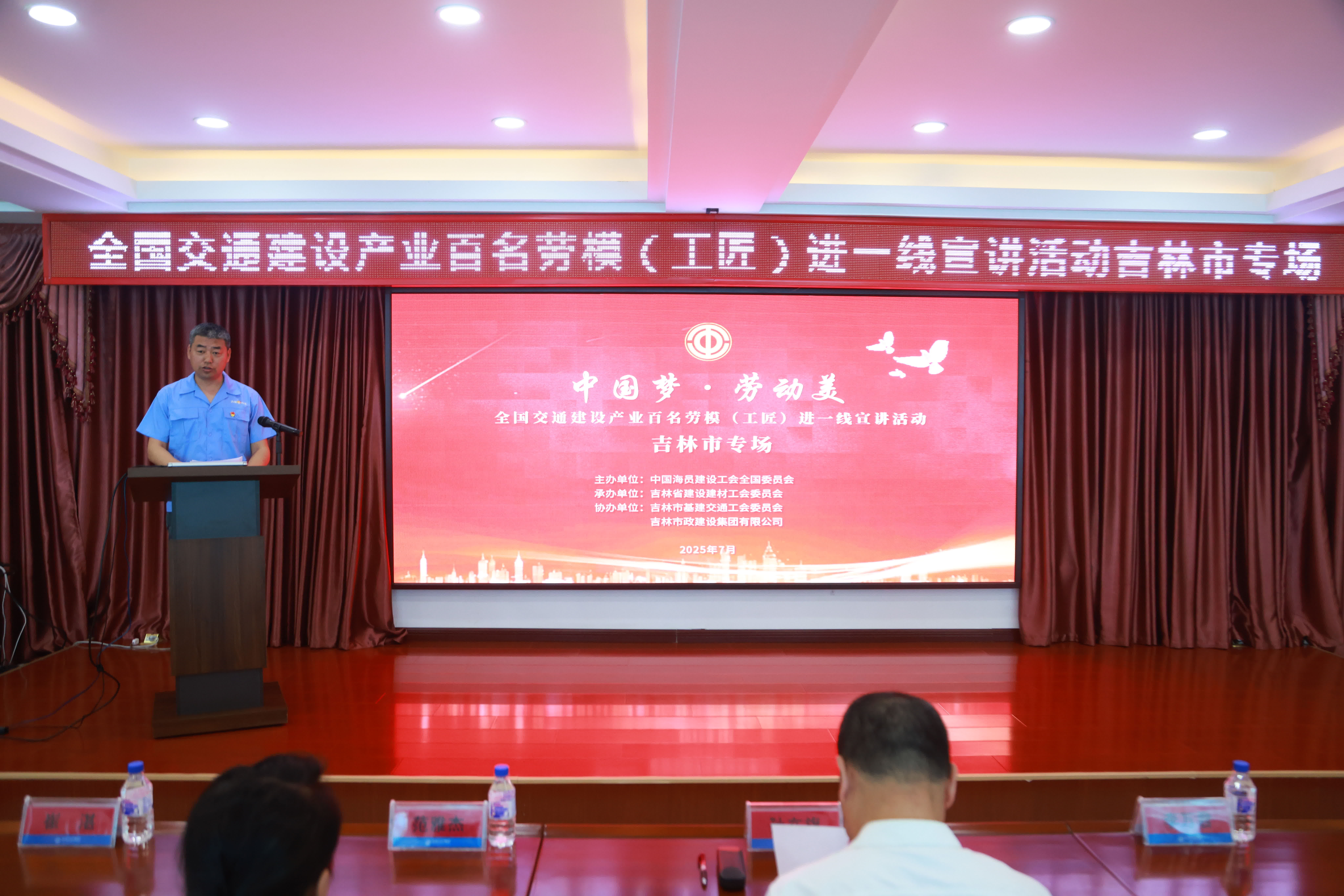 7月22日,由中国海员建设工会全国委员会主办,吉林省建设建材工会承办,吉林市基建交通工会、吉林市政建设集团有限公司协办的中国工人大思政课暨中国梦?劳动美——全国交通建设产业百名劳模(工匠)进一线吉林市专场宣讲活动在吉林市政集团举行。