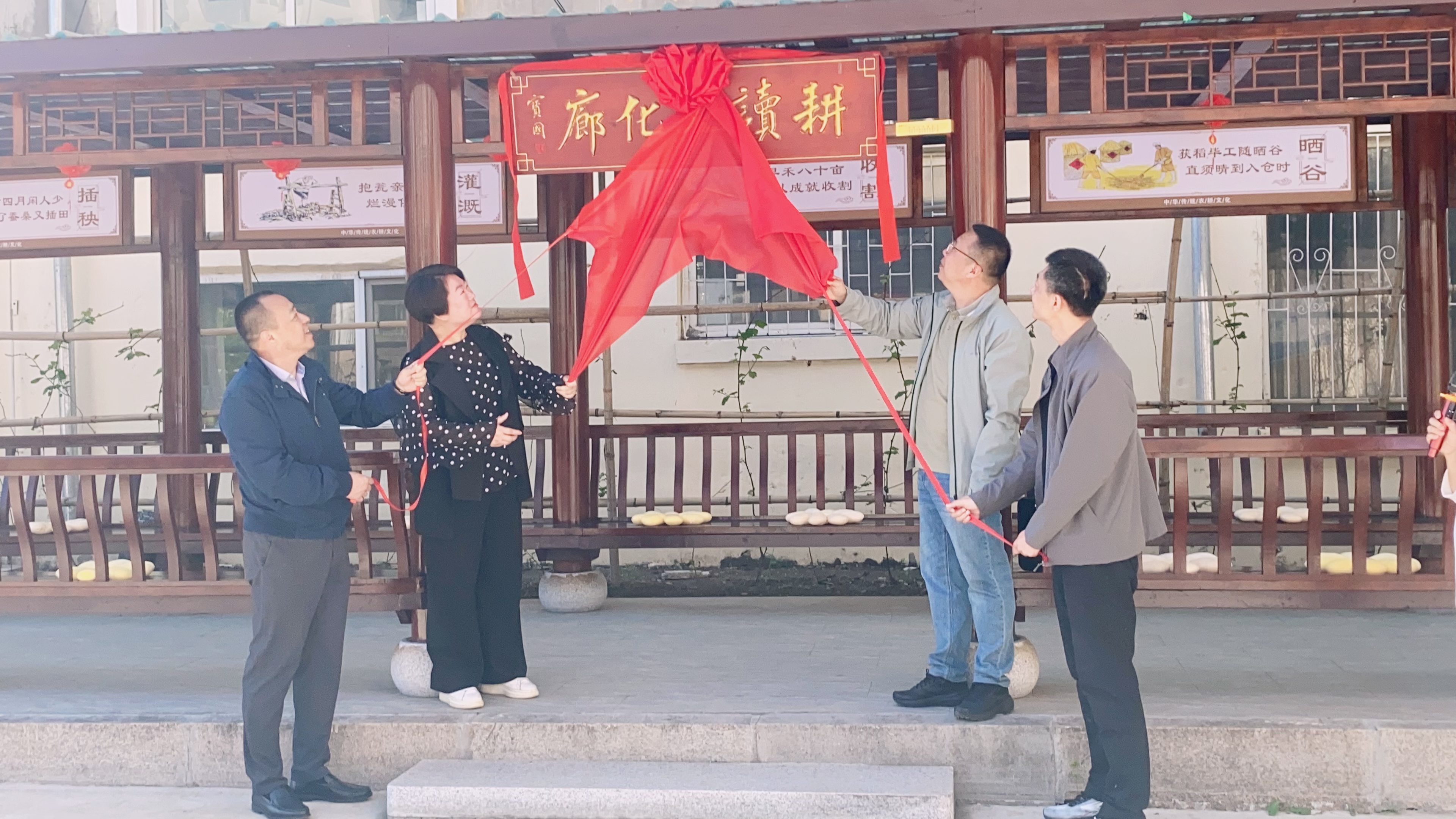 仪式上,吉林市政集团党委副书记、工会主席代为,吉林市慈善总会秘书长孙洋,吉林市广播电视台交通广播总监吴月,船营区教育局副局长齐立岩,共同为耕读文化廊揭牌。