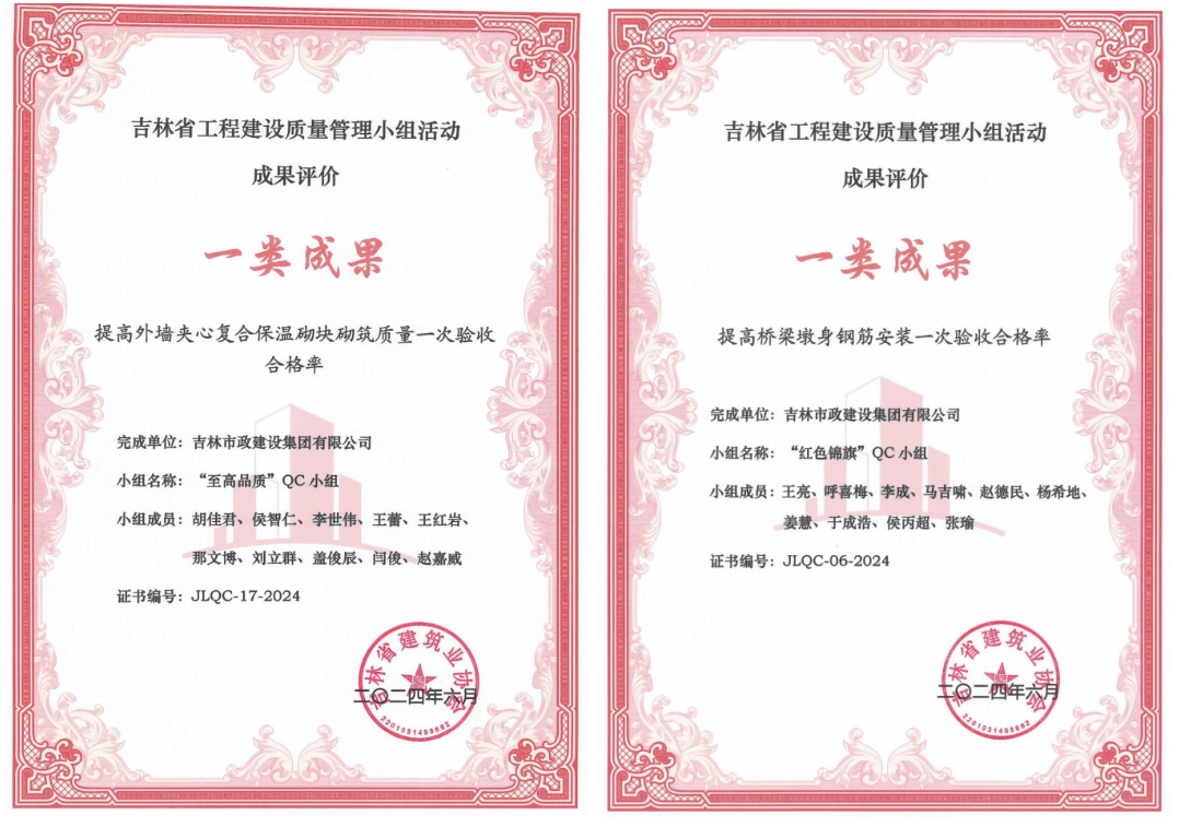 由吉林省建筑业协会组织的2024年度吉林省工程建设质量管理小组活动成果评价结果于近期公布,集团公司荣获一类成果4项、二类成果3项。