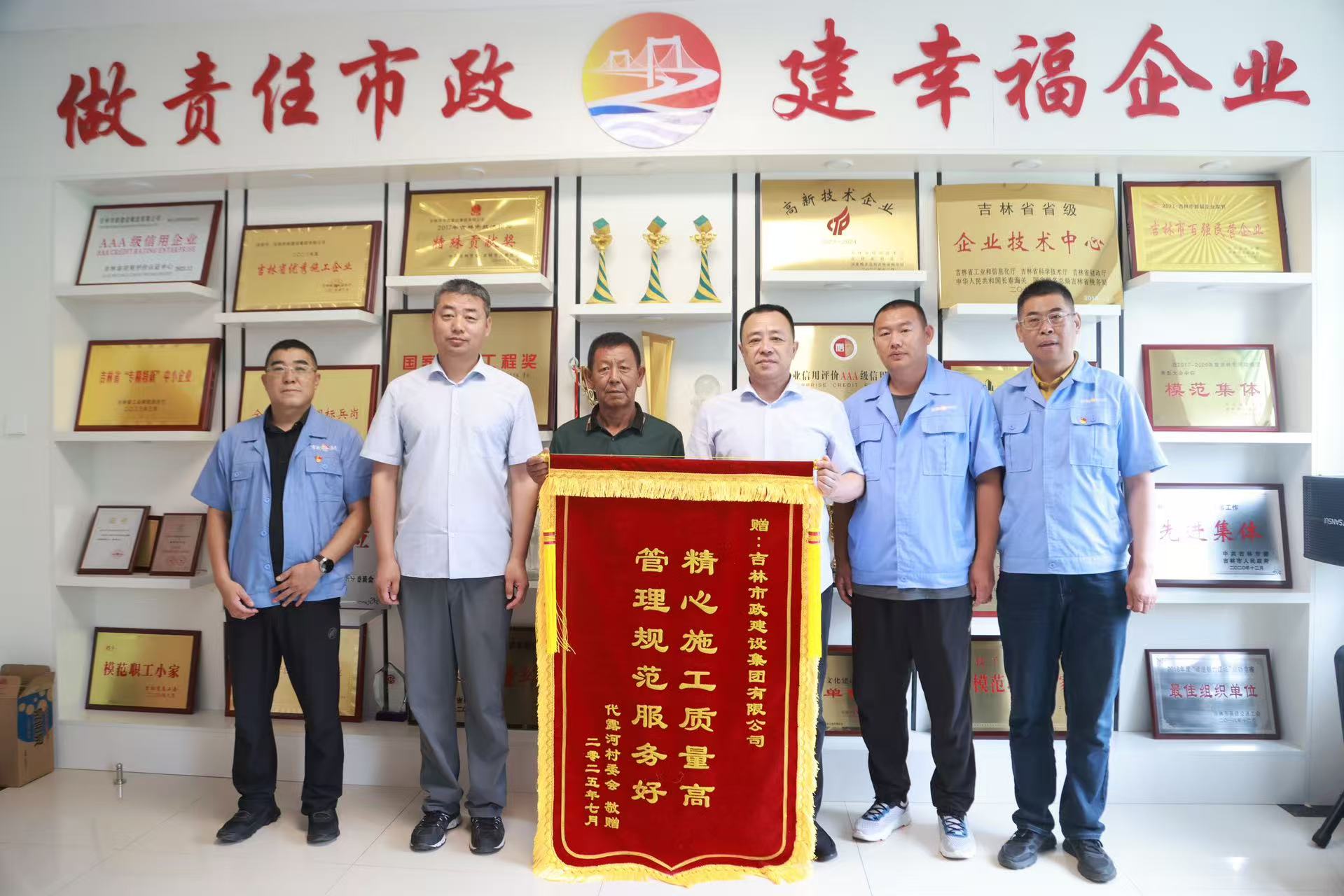 7月21日,烈日当空,蛟河市松江镇代露河村委会朱书记带着村民的满满心意,专程来到集团公司,将一面印着“精心施工质量高、管理规范服务好”的锦旗送到集团公司,以感谢桥梁分公司为村里